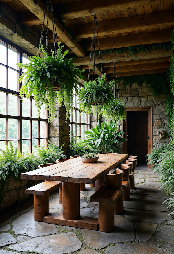 - Bancos y mesas de madera reciclada o tratada con aceites naturales.