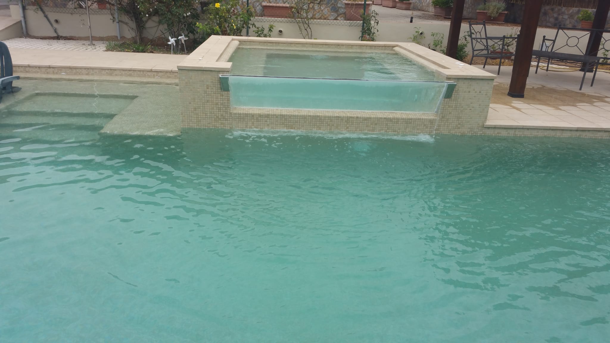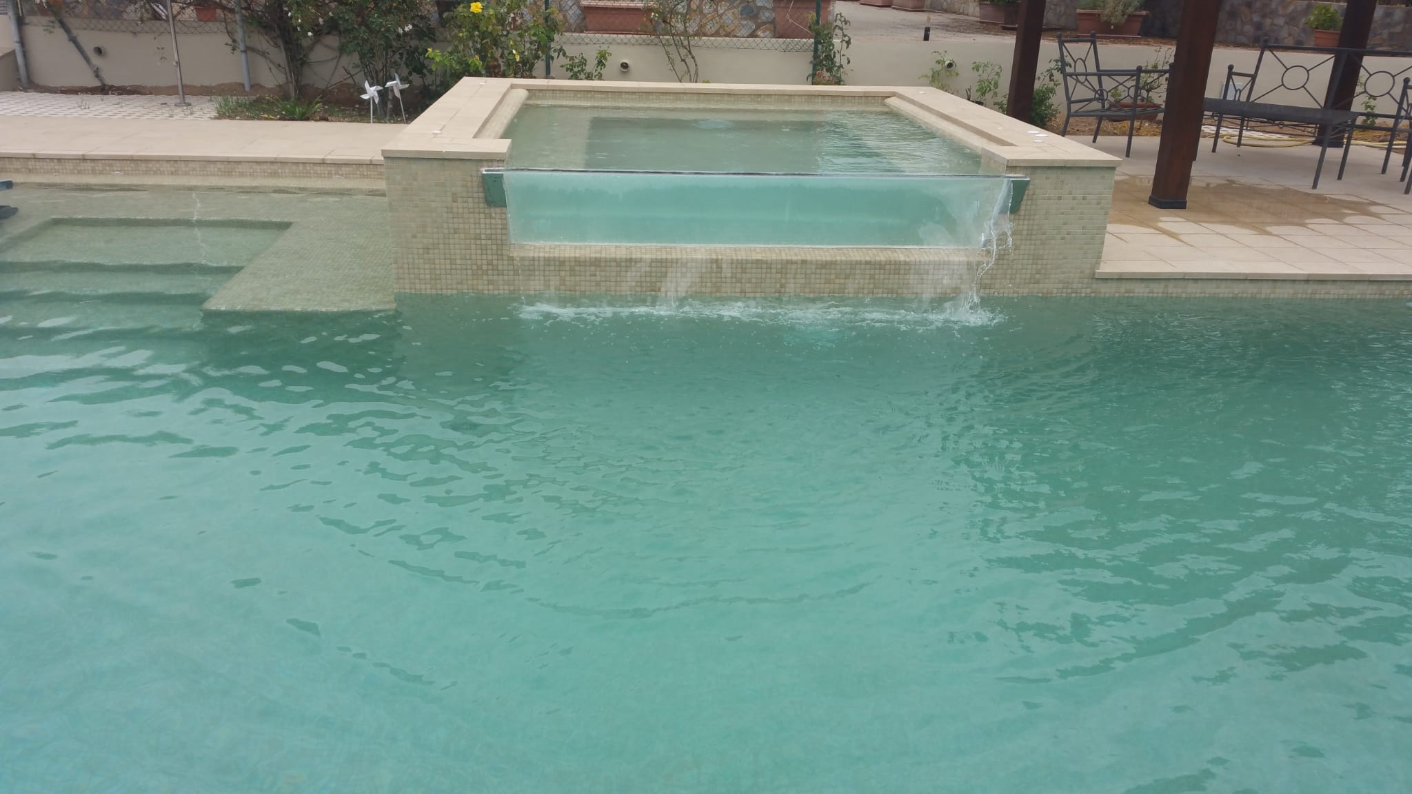 💧 Jacuzzi elevado: separado de la piscina con cascada o efecto desbordante.