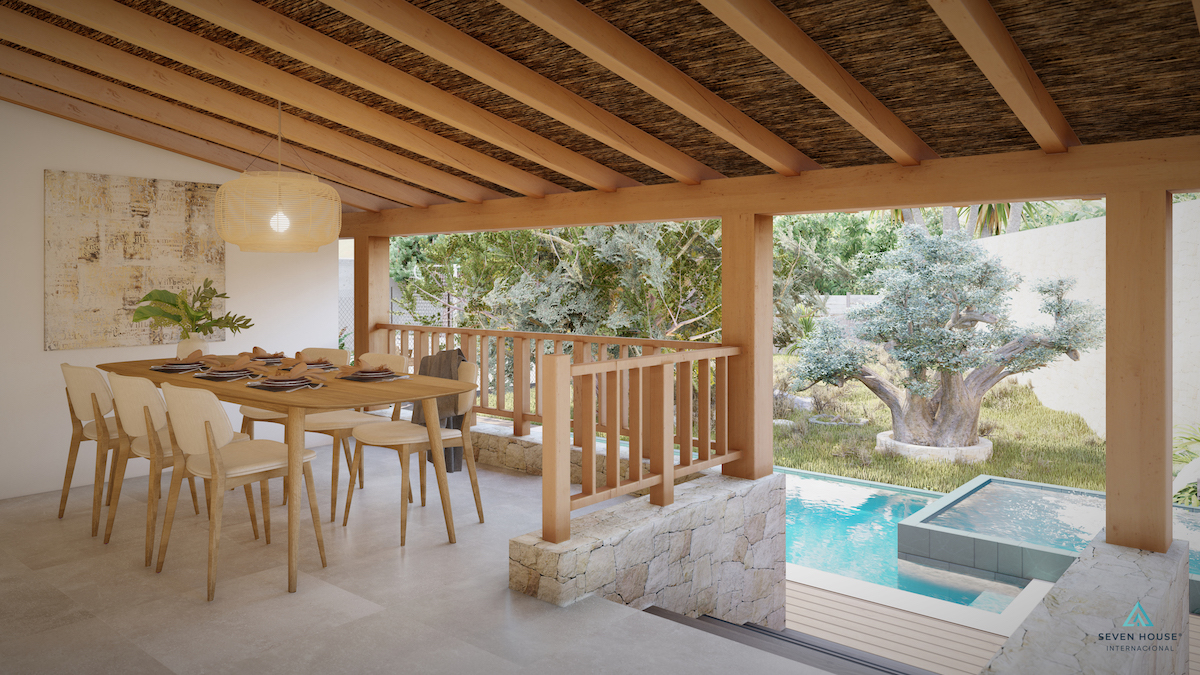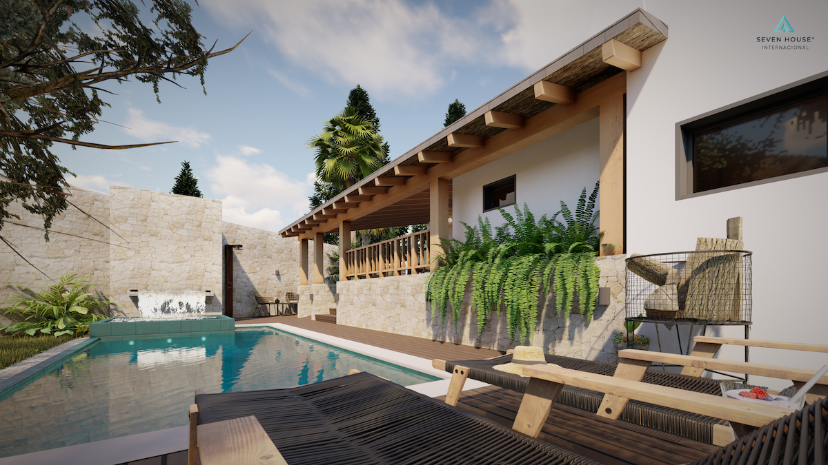 ✅ Zona de solárium y acabados en piedra natural, en sintonía con la arquitectura de la villa.